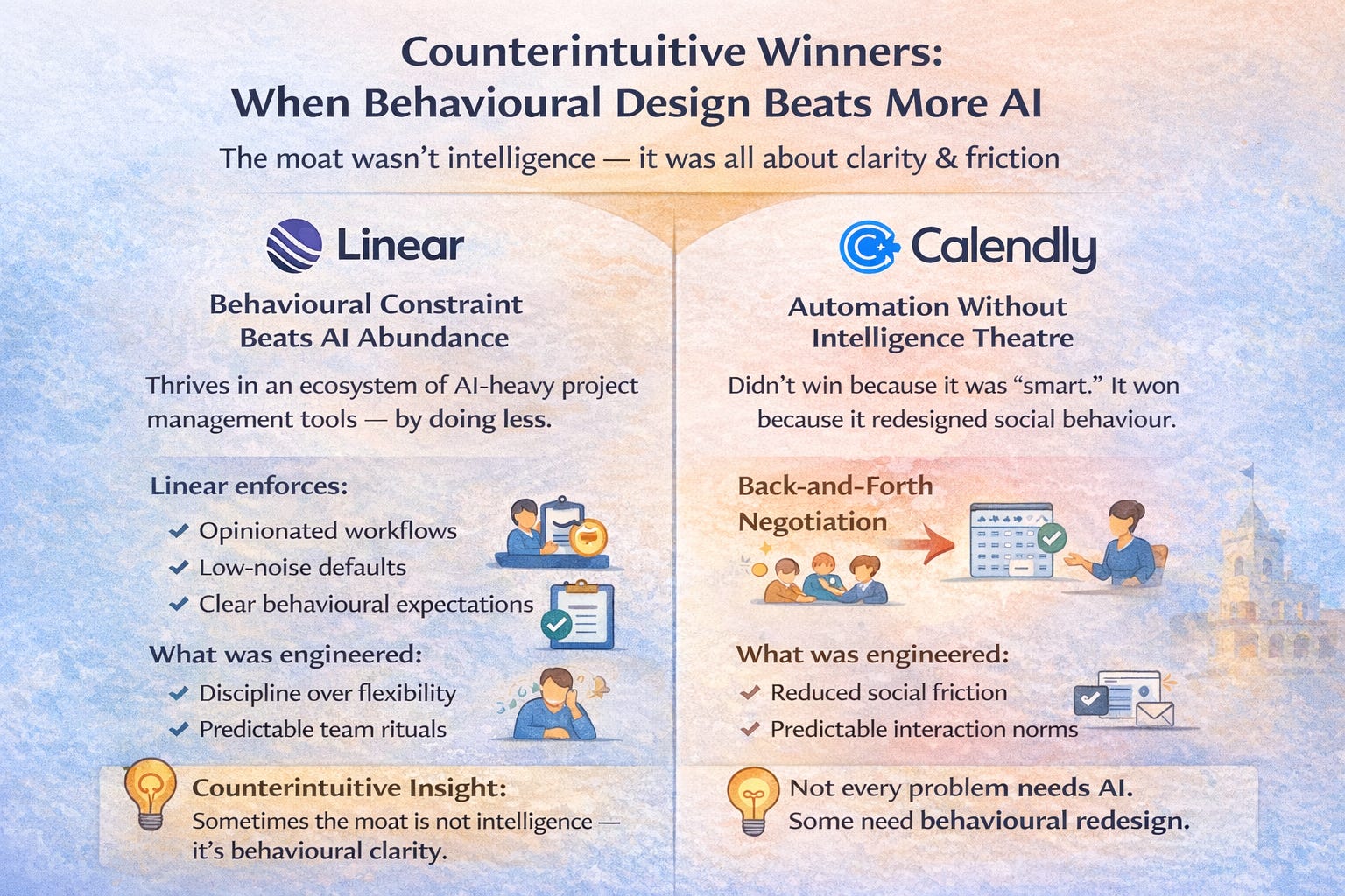 Calendly eliminated scheduling friction not through intelligence, but through behavioural redesign. Calendly shifted scheduling from a socially awkward, back-and-forth negotiation to a simple asynchronous expectation. Users share availability once; the system enforces the norm.