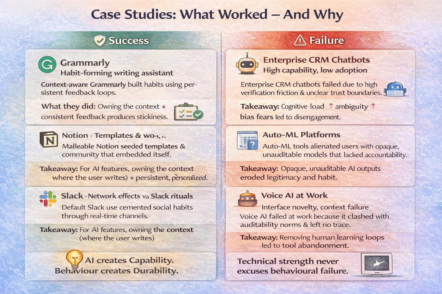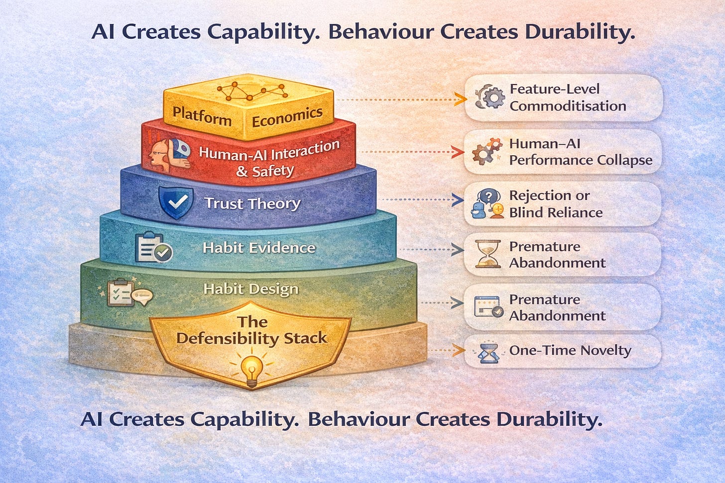 Users don’t just buy capabilities — they buy predictable habits and institutional practices. Habit formation research shows that repeated performance in consistent contexts creates automaticity; products that anchor new workflows into users’ routines create durable behavioural lock-in.